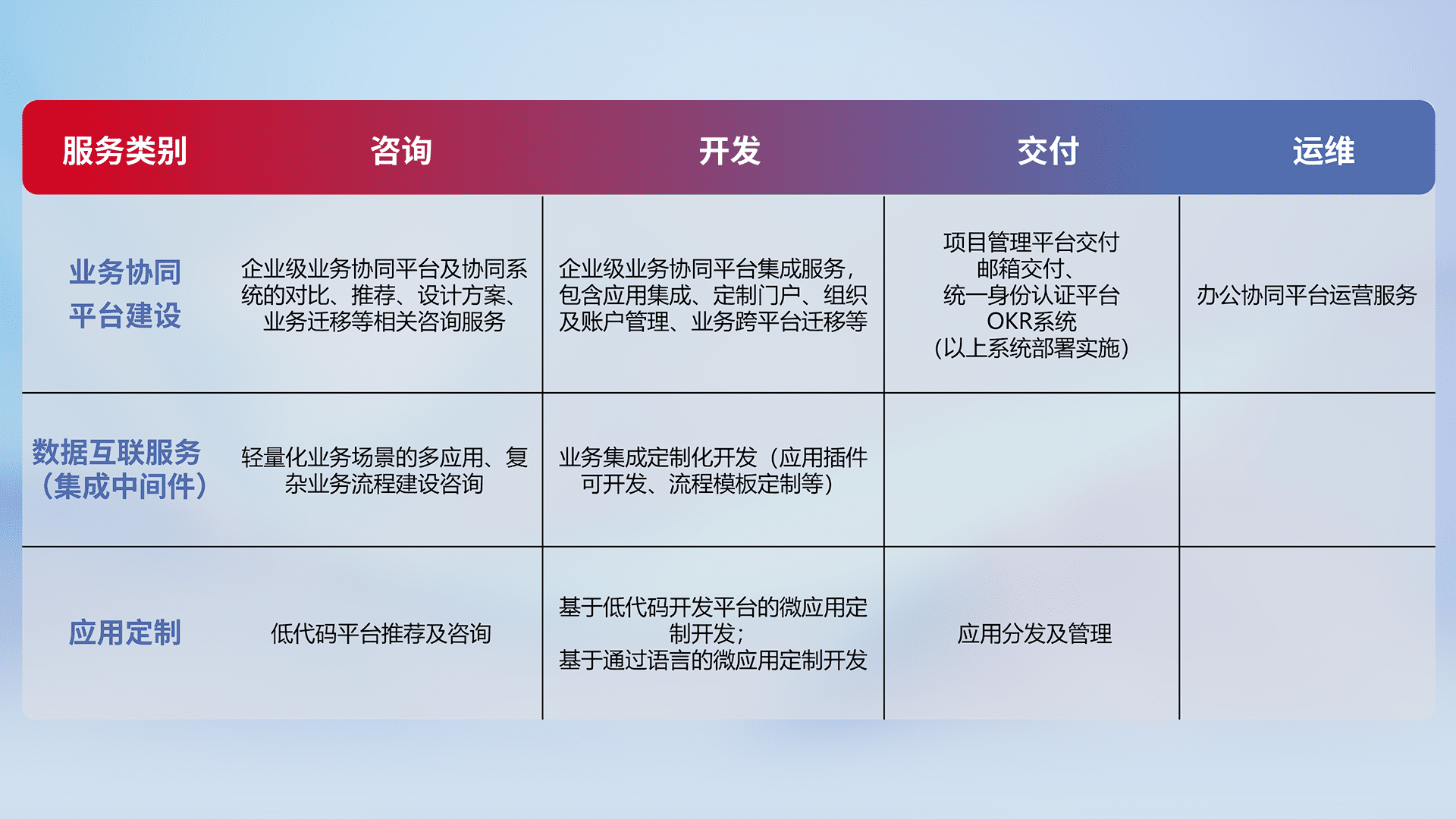 针对钉钉、、、企微、、IDaas等平台级产品提供产品的规划、、、方案、、交付、、定制化开发等服务,,实现如统一协同办公、、、、智能客户服务、、混合会议管理、、、智能数据查询、、等业务场景,,,,实现数字化转型。。。。